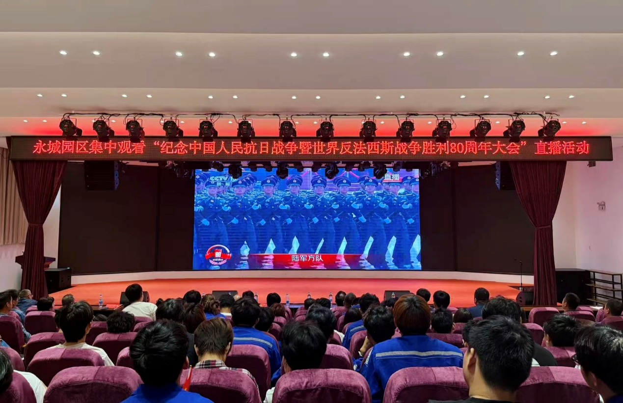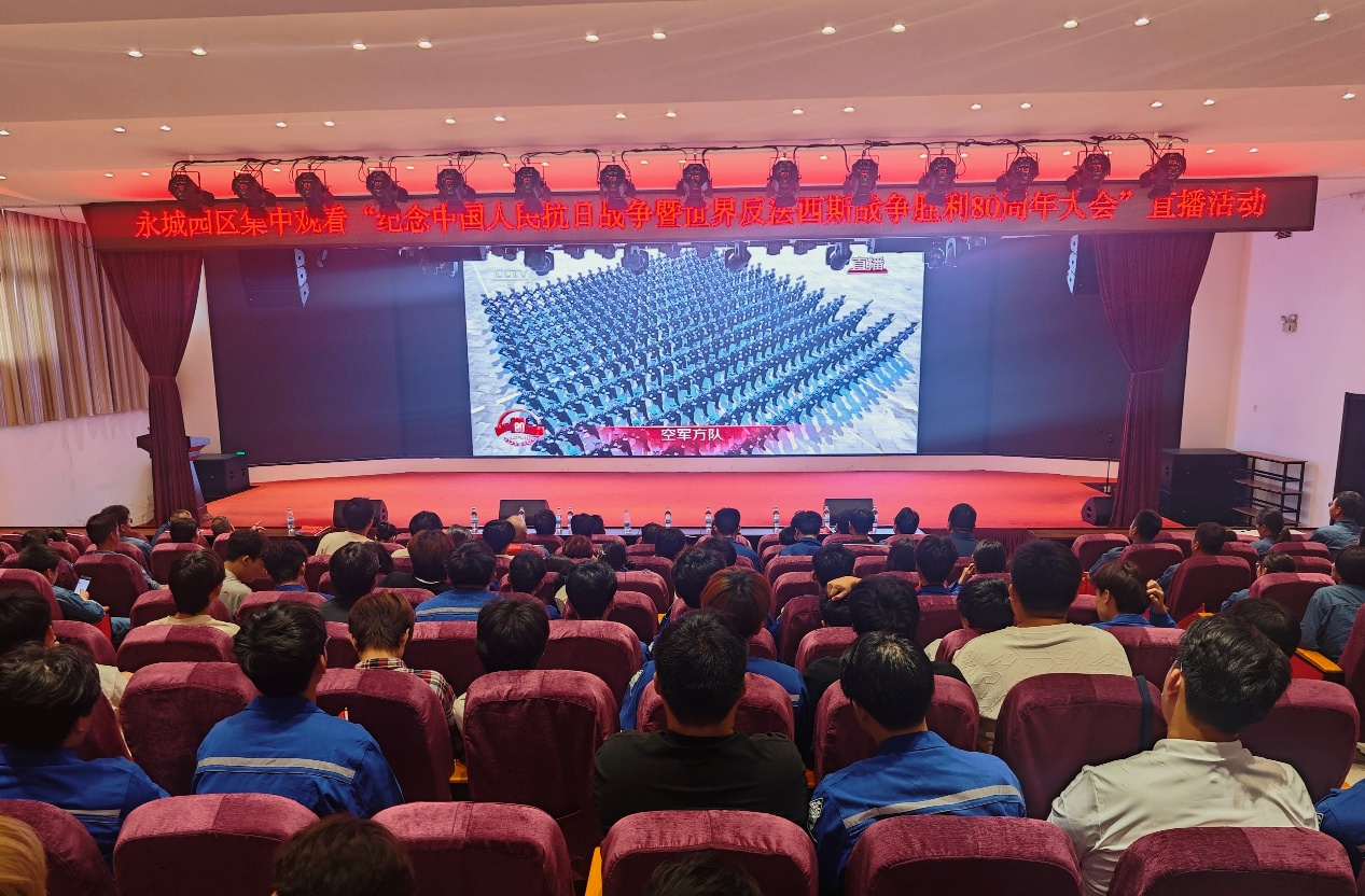 9月3日上午,太阳成tyc7111cc能源化工产业公司2401班的57名员工,在永城龙宇煤化工有限公司的礼堂,与单位职工代表一同观看了纪念中国人民抗日战争暨世界反法西斯战争胜利80周年大会直播。